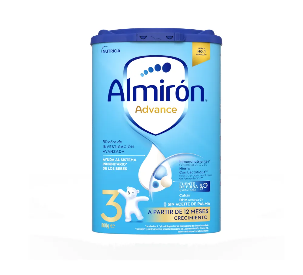 Almirón Advance 3 800g Leche de crecimiento para bebés a partir de los 12 meses, con su combinación unica de ingredientes y nutrientes, contribuye al desarrollo futuro del bebé.